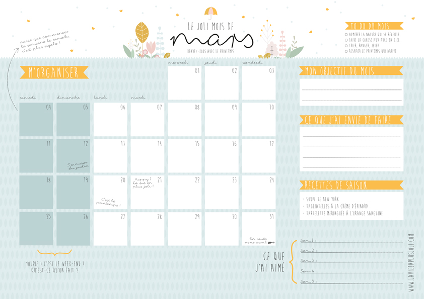 Je cherchais un joli calendrier pour planifier mon mois de mars et voilà que je tombe sur votre sublime calendrier 🙂 Il est juste parfait ! Merci