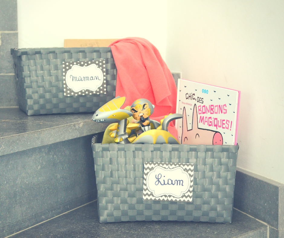 Chacun colle une jolie étiquette avec son petit nom sur son panier et les paniers sont disposés à un endroit stratégique et visible de la maison. Les escaliers pour monter à l’étage fonctionnent pas mal, sauf en cas de mari atteint d’une cécité sélective comme le mien (c’est-à-dire qui ignore systématiquement les choses à monter placées en bas des escaliers). 😉
